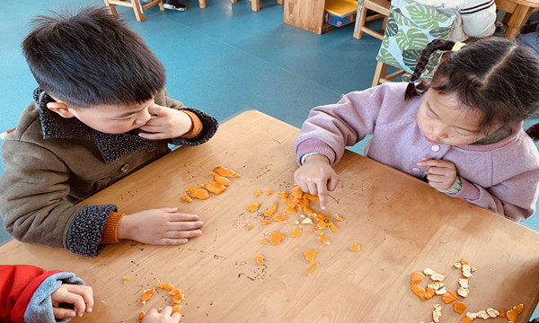 12月27日的午后,吃完餐后水果,顾承轩拿着剥下来的橘子皮,边看边说:我觉得我剥了个小蛇,孙夏:我感觉我的是美人鱼,橘子皮顿时成为了孩子们手里炙手可热的游戏材料。